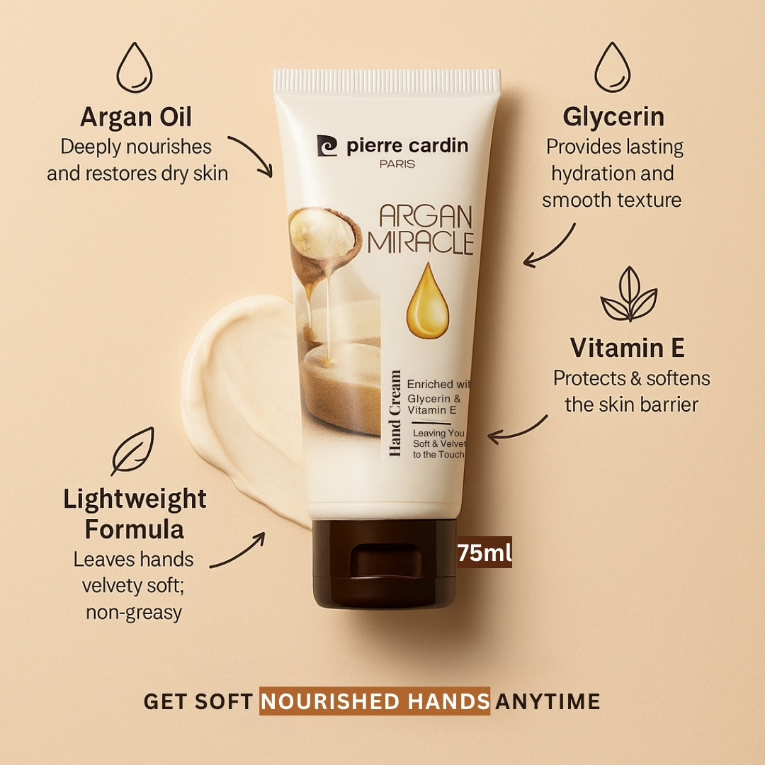 Experience the nourishing power of Argan Miracle Hand Cream in a convenient 75ml size. This expert-formulated cream deeply hydrates and restores skin softness, thanks to the enriching properties of argan oil. Ideal for daily use, it helps protect hands from dryness and environmental stress, leaving them smooth, supple, and revitalized.
